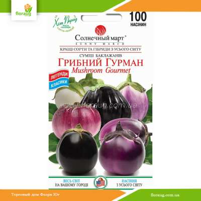 Некоторые сорта из всего разнообразия баклажанов имеют необычный грибной вкус, который делает их пикантными, а приготовленные из них блюда необычными. Все эти разновидности собраны в специальной смеси Mushroom Gourmet, которая давно пользуется популярностью в США, будучи незаменимой в известном блюде Baba ganoush, они восхитительны жареными и тушеными в оливковом масле и просто приготовленные на гриле. Ценятся за высокие вкусовые качества, широко используются в кулинарии в сыром виде. Это смесь яйцевидных и широко-грушевидных баклажанов разнообразных ярких окрасок, от снежно-белой до пурпурных и красноватых румян, сиреневых тонов и почти черного насыщенного цвета. Эти мясистые плоды весом от 120 до 250 г, лишены горечи, их белая плотная, сочная и нежная мякоть содержит мало семян. Сорта этого бленда длительного и волнообразного плодоношения, от ранних до среднеспелых, с первым сбором через 60-70 дней от пересадки. Растения компактные, вырастают в высоту 50-70 см и не требуют подвязки